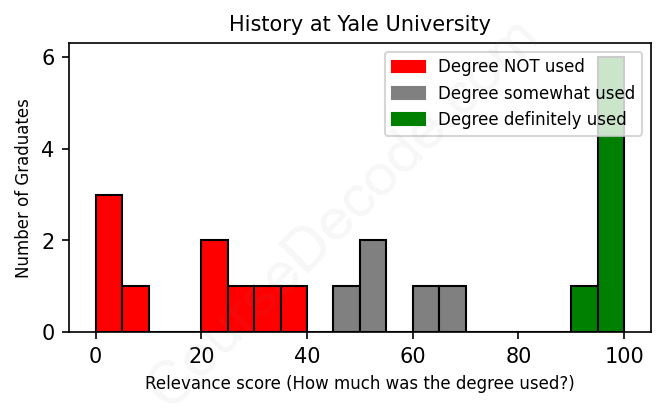 The verdict? Significantly below average. Overall, with an average relevance score of 53%, History graduates from Yale University have a much lower likelihood (-14%) of finding work in this field compared to the average graduate across all fields: