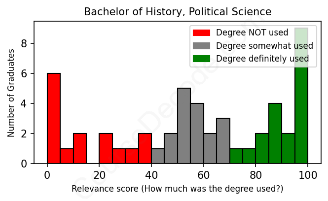 The verdict? Slightly below average. Overall, with an average relevance score of 66%, History, Political Science graduates have a slightly lower likelihood (-1%) of finding work in this field compared to the average graduate across all fields: