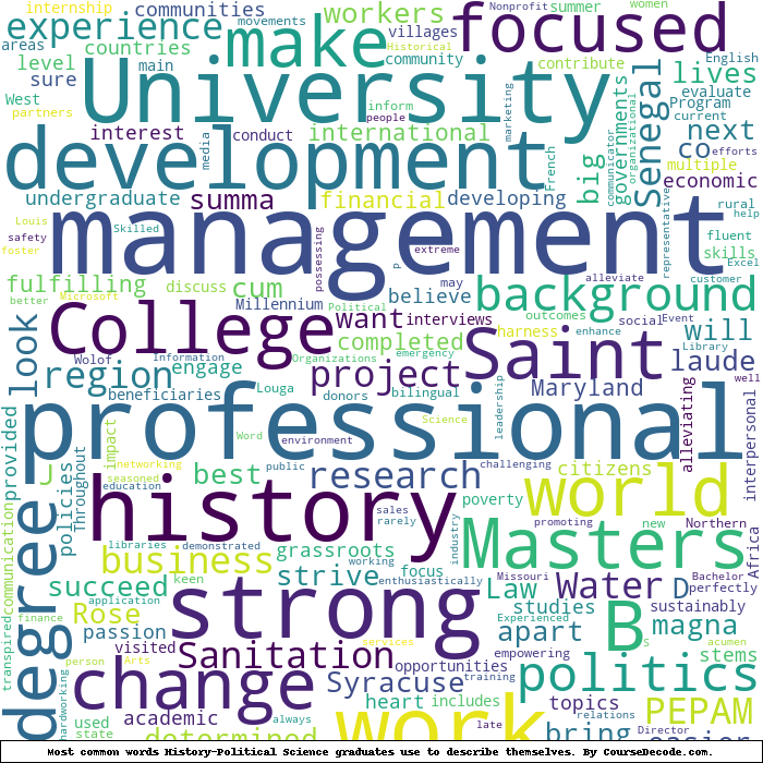 Here is a visual representation of the most common words seen in the "about" section of LinkedIn profiles who have a Bachelor degree in History, Political Science. This may or may not be useful: