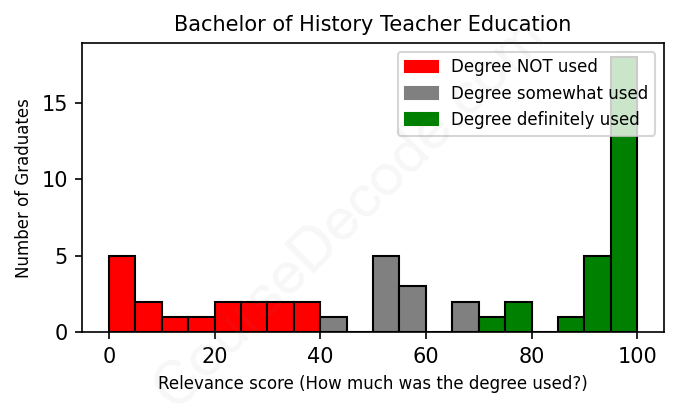 The verdict? Slightly below average. Overall, with an average relevance score of 62%, History Teacher Education graduates have a slightly lower likelihood (-5%) of finding work in this field compared to the average graduate across all fields: