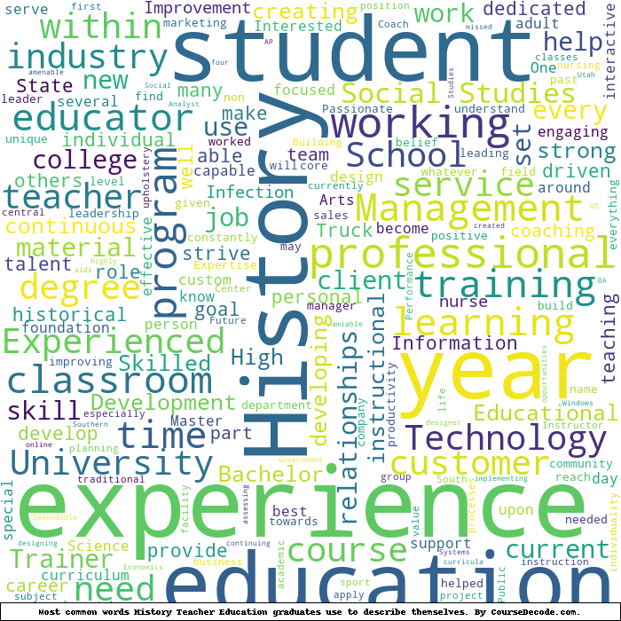 Here is a visual representation of the most common words seen in the "about" section of LinkedIn profiles who have a Bachelor degree in History Teacher Education. This may or may not be useful: