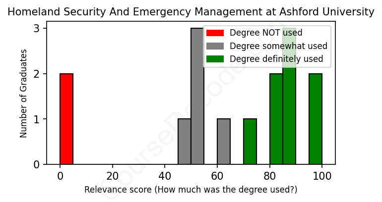 The verdict? Slightly below average. Overall, with an average relevance score of 63%, Homeland Security And Emergency Management graduates from Ashford University have a slightly lower likelihood (-4%) of finding work in this field compared to the average graduate across all fields: