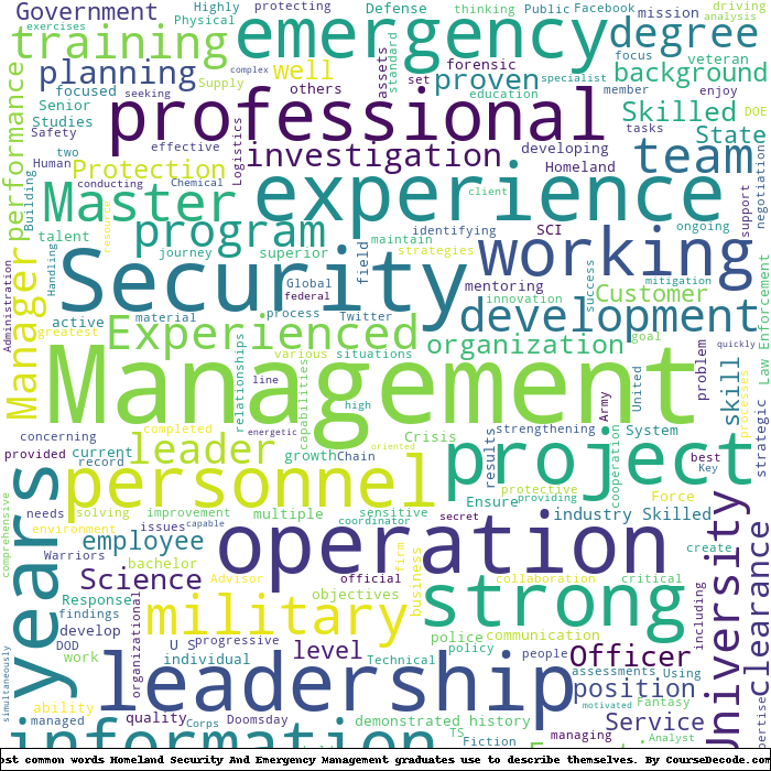 Here is a visual representation of the most common words seen in the "about" section of LinkedIn profiles who have a Bachelor degree in Homeland Security And Emergency Management (this is across all Homeland Security And Emergency Management graduates we've analyzed, not just those who went to Ashford University). This may or may not be useful: