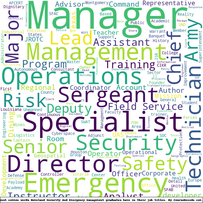 Here is a visual representation of the most common words in job titles for Homeland Security And Emergency Management graduates (this is across all Homeland Security And Emergency Management graduates we've analyzed, not just those who went to Ashford University):