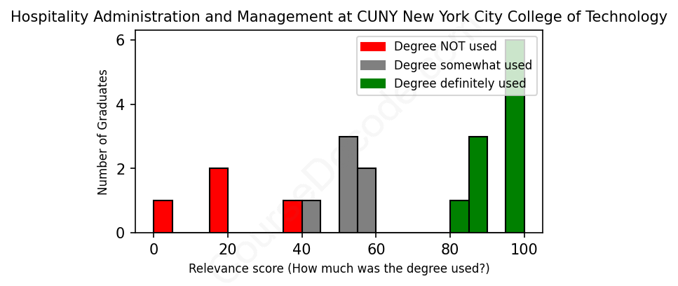 The verdict? Slightly below average. Overall, with an average relevance score of 66%, Hospitality Administration and Management graduates from CUNY New York City College of Technology have a slightly lower likelihood (-1%) of finding work in this field compared to the average graduate across all fields:
