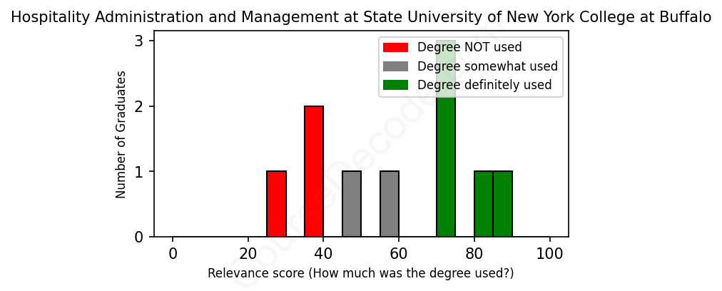 The verdict? Below average. Overall, with an average relevance score of 58%, Hospitality Administration and Management graduates from State University of New York College at Buffalo have a lower likelihood (-9%) of finding work in this field compared to the average graduate across all fields: