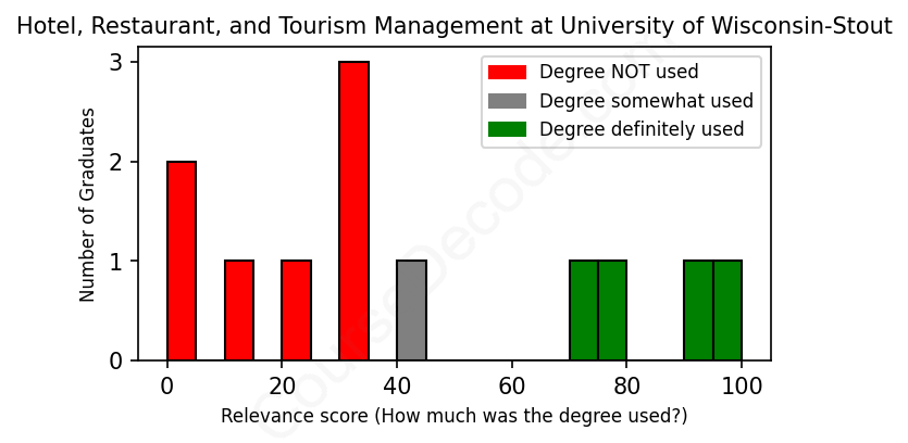 First, some facts. Of the Hotel, Restaurant, and Tourism Management graduates from University of Wisconsin-Stout we've analyzed , here's how many have used (or NOT used) their degree in their career: