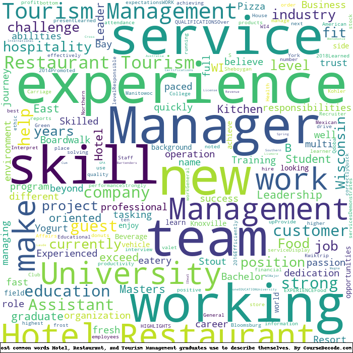 Here is a visual representation of the most common words seen in the "about" section of LinkedIn profiles who have a Bachelor degree in Hotel, Restaurant, and Tourism Management (this is across all Hotel, Restaurant, and Tourism Management graduates we've analyzed, not just those who went to University of Wisconsin-Stout). This may or may not be useful: