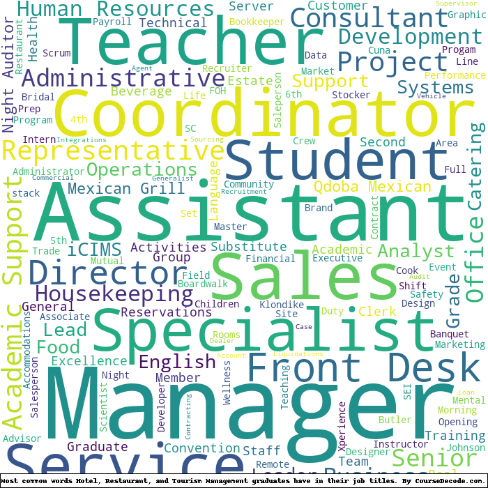 Here is a visual representation of the most common words in job titles for Hotel, Restaurant, and Tourism Management graduates (this is across all Hotel, Restaurant, and Tourism Management graduates we've analyzed, not just those who went to University of Wisconsin-Stout):
