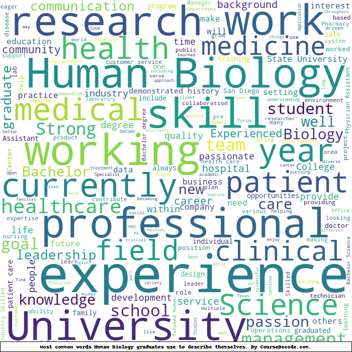 Here is a visual representation of the most common words seen in the "about" section of LinkedIn profiles who have a Bachelor degree in Human Biology. This may or may not be useful: