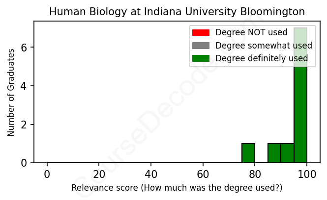 The verdict? Great! Overall, with an average relevance score of 95%, Human Biology graduates from Indiana University Bloomington have a substantially higher likelihood (+28%) of finding work in this field compared to the average graduate across all fields: