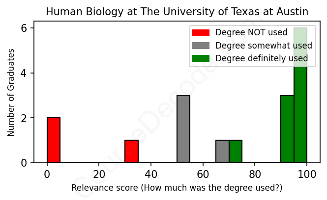 The verdict? Slightly above average. Overall, with an average relevance score of 69%, Human Biology graduates from The University of Texas at Austin have a slightly higher likelihood (+2%) of finding work in this field compared to the average graduate across all fields: