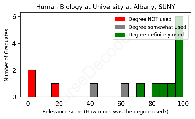 The verdict? Slightly above average. Overall, with an average relevance score of 69%, Human Biology graduates from University at Albany, SUNY have a slightly higher likelihood (+2%) of finding work in this field compared to the average graduate across all fields: