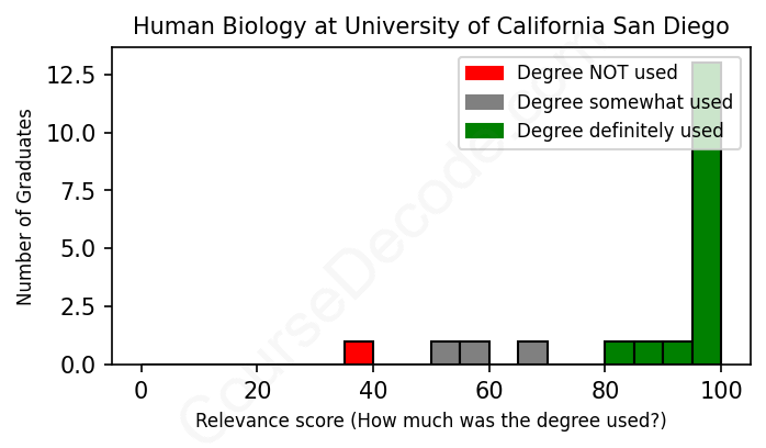 The verdict? Significantly above average. Overall, with an average relevance score of 86%, Human Biology graduates from University of California, San Diego have a much higher likelihood (+19%) of finding work in this field compared to the average graduate across all fields: