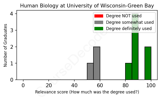 The verdict? Significantly above average. Overall, with an average relevance score of 79%, Human Biology graduates from University of Wisconsin-Green Bay have a much higher likelihood (+12%) of finding work in this field compared to the average graduate across all fields: