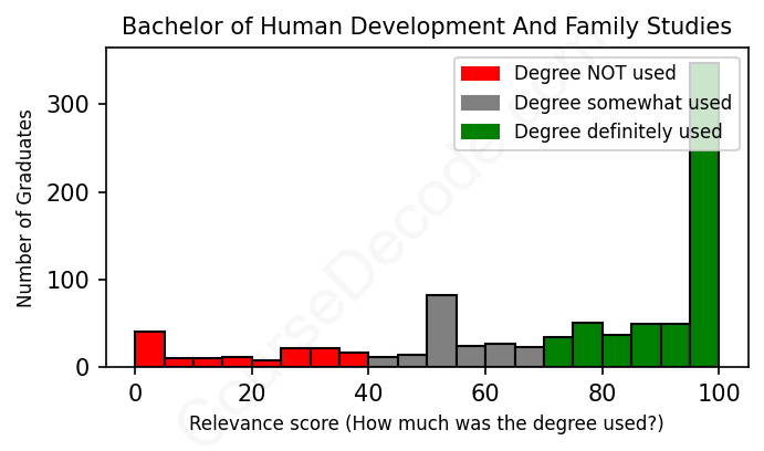The verdict? Above average. Overall, with an average relevance score of 73%, Human Development And Family Studies graduates have a higher likelihood (+6%) of finding work in this field compared to the average graduate across all fields: