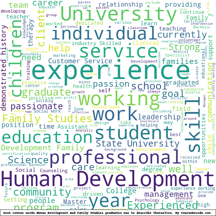 Here is a visual representation of the most common words seen in the "about" section of LinkedIn profiles who have a Bachelor degree in Human Development And Family Studies. This may or may not be useful: