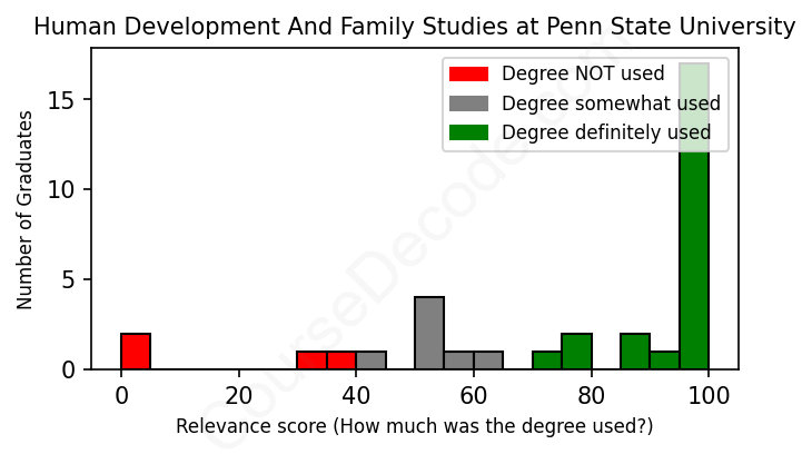 The verdict? Above average. Overall, with an average relevance score of 76%, Human Development And Family Studies graduates from Penn State University have a higher likelihood (+9%) of finding work in this field compared to the average graduate across all fields: