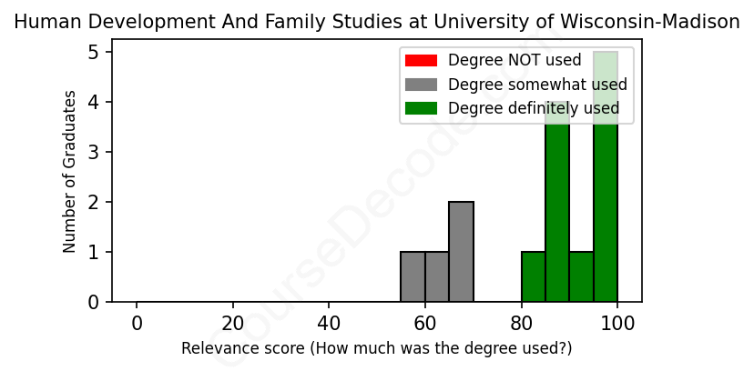 The verdict? Significantly above average. Overall, with an average relevance score of 84%, Human Development And Family Studies graduates from University of Wisconsin-Madison have a much higher likelihood (+17%) of finding work in this field compared to the average graduate across all fields: