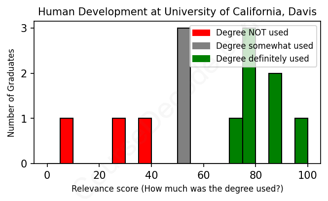 The verdict? Below average. Overall, with an average relevance score of 61%, Human Development graduates from University of California, Davis have a lower likelihood (-6%) of finding work in this field compared to the average graduate across all fields: