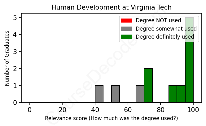 The verdict? Significantly above average. Overall, with an average relevance score of 81%, Human Development graduates from Virginia Tech have a much higher likelihood (+14%) of finding work in this field compared to the average graduate across all fields: