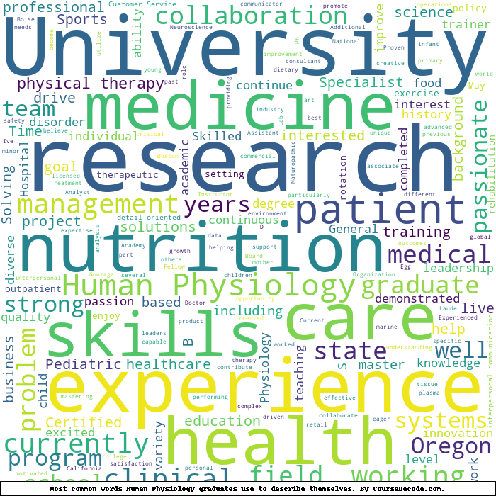 Here is a visual representation of the most common words seen in the "about" section of LinkedIn profiles who have a Bachelor degree in Human Physiology. This may or may not be useful: