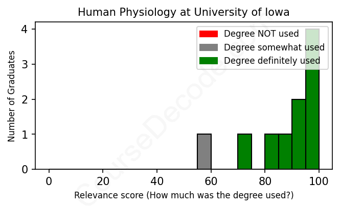 The verdict? Great! Overall, with an average relevance score of 88%, Human Physiology graduates from University of Iowa have a substantially higher likelihood (+21%) of finding work in this field compared to the average graduate across all fields:
