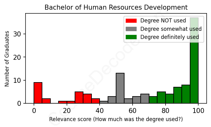 The verdict? Slightly above average. Overall, with an average relevance score of 68%, Human Resources Development graduates have a slightly higher likelihood (+1%) of finding work in this field compared to the average graduate across all fields: