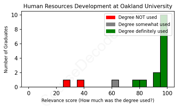 The verdict? Significantly above average. Overall, with an average relevance score of 85%, Human Resources Development graduates from Oakland University have a much higher likelihood (+18%) of finding work in this field compared to the average graduate across all fields: