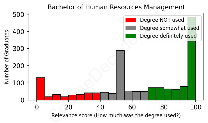 The verdict? Slightly below average. Overall, with an average relevance score of 64%, Human Resources Management graduates have a slightly lower likelihood (-3%) of finding work in this field compared to the average graduate across all fields: