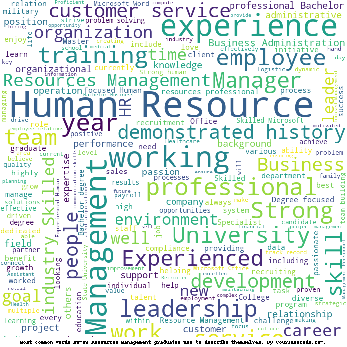Here is a visual representation of the most common words seen in the "about" section of LinkedIn profiles who have a Bachelor degree in Human Resources Management. This may or may not be useful: