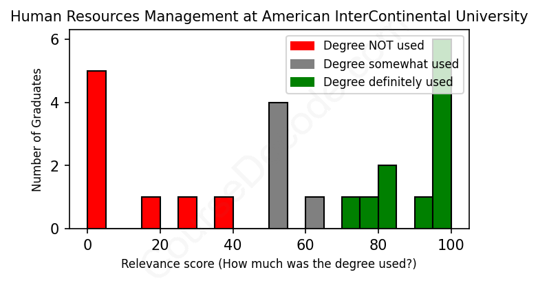 The verdict? Significantly below average. Overall, with an average relevance score of 56%, Human Resources Management graduates from American InterContinental University have a much lower likelihood (-11%) of finding work in this field compared to the average graduate across all fields: