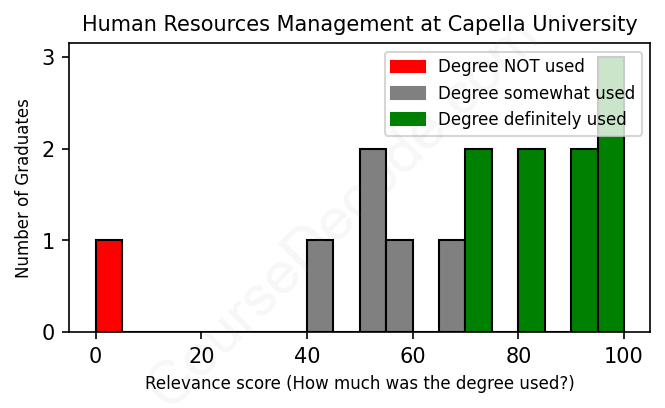 The verdict? Slightly above average. Overall, with an average relevance score of 70%, Human Resources Management graduates from Capella University have a slightly higher likelihood (+3%) of finding work in this field compared to the average graduate across all fields: