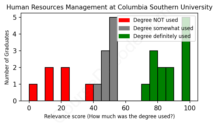The verdict? Below average. Overall, with an average relevance score of 59%, Human Resources Management graduates from Columbia Southern University have a lower likelihood (-8%) of finding work in this field compared to the average graduate across all fields: