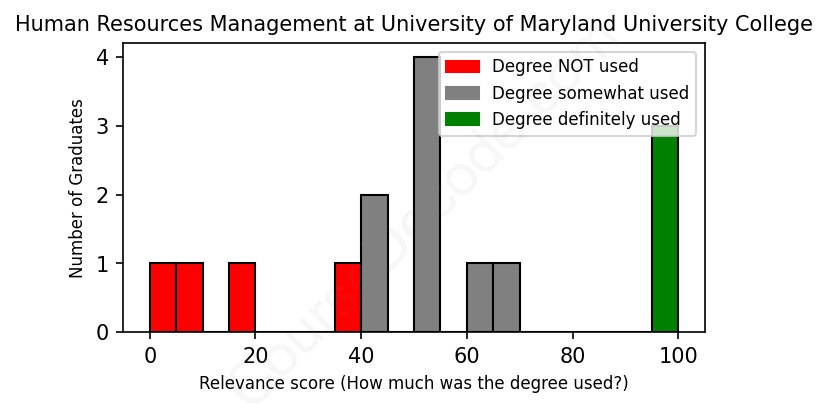 First, some facts. Of the Human Resources Management graduates from University of Maryland University College we've analyzed , here's how many have used (or NOT used) their degree in their career: