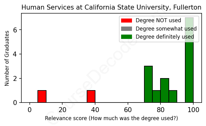 The verdict? Significantly above average. Overall, with an average relevance score of 80%, Human Services graduates from California State University, Fullerton have a much higher likelihood (+13%) of finding work in this field compared to the average graduate across all fields: