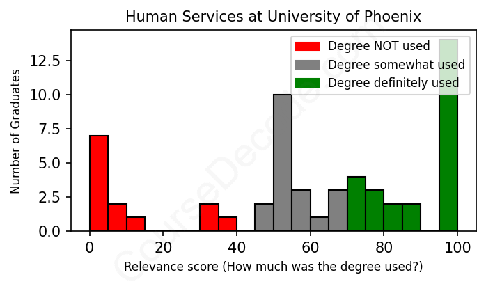 The verdict? Below average. Overall, with an average relevance score of 59%, Human Services graduates from University of Phoenix have a lower likelihood (-8%) of finding work in this field compared to the average graduate across all fields: