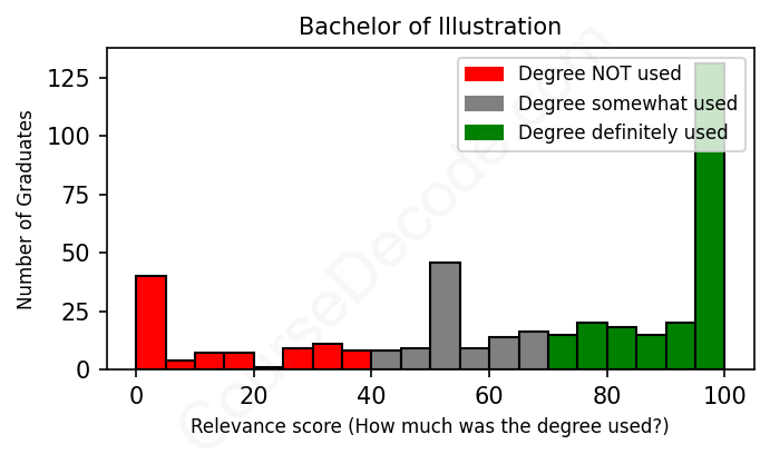 The verdict? Slightly below average. Overall, with an average relevance score of 66%, Illustration graduates have a slightly lower likelihood (-1%) of finding work in this field compared to the average graduate across all fields: