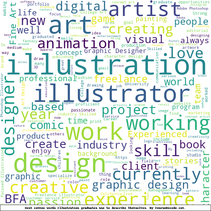 Here is a visual representation of the most common words seen in the "about" section of LinkedIn profiles who have a Bachelor degree in Illustration. This may or may not be useful: