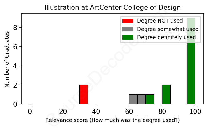 The verdict? Significantly above average. Overall, with an average relevance score of 83%, Illustration graduates from ArtCenter College of Design have a much higher likelihood (+16%) of finding work in this field compared to the average graduate across all fields: