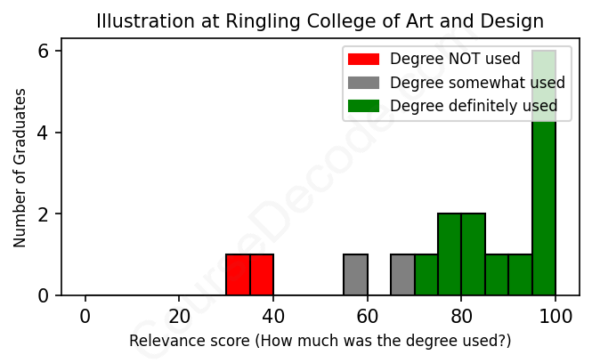 The verdict? Significantly above average. Overall, with an average relevance score of 79%, Illustration graduates from Ringling College of Art and Design have a much higher likelihood (+12%) of finding work in this field compared to the average graduate across all fields: