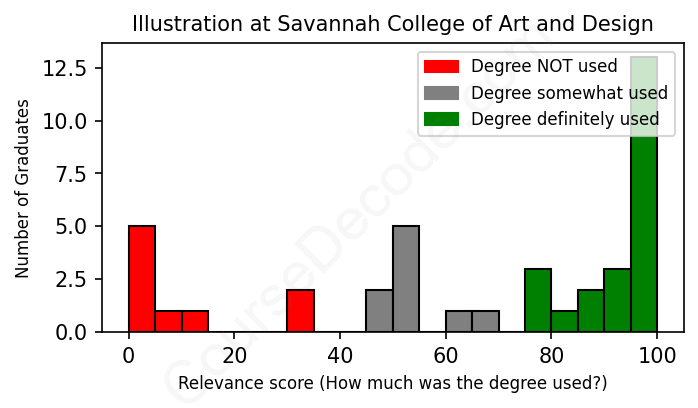 The verdict? Slightly below average. Overall, with an average relevance score of 65%, Illustration graduates from Savannah College of Art and Design have a slightly lower likelihood (-2%) of finding work in this field compared to the average graduate across all fields: