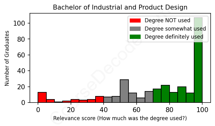 The verdict? Slightly above average. Overall, with an average relevance score of 72%, Industrial and Product Design graduates have a slightly higher likelihood (+5%) of finding work in this field compared to the average graduate across all fields: