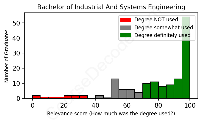 The verdict? Above average. Overall, with an average relevance score of 77%, Industrial And Systems Engineering graduates have a higher likelihood (+10%) of finding work in this field compared to the average graduate across all fields: