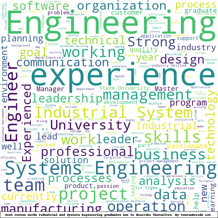 Here is a visual representation of the most common words seen in the "about" section of LinkedIn profiles who have a Bachelor degree in Industrial And Systems Engineering. This may or may not be useful:
