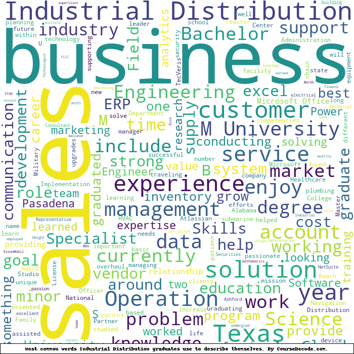 Here is a visual representation of the most common words seen in the "about" section of LinkedIn profiles who have a Bachelor degree in Industrial Distribution. This may or may not be useful: