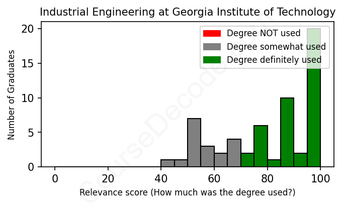 The verdict? Significantly above average. Overall, with an average relevance score of 80%, Industrial Engineering graduates from Georgia Institute of Technology have a much higher likelihood (+13%) of finding work in this field compared to the average graduate across all fields: