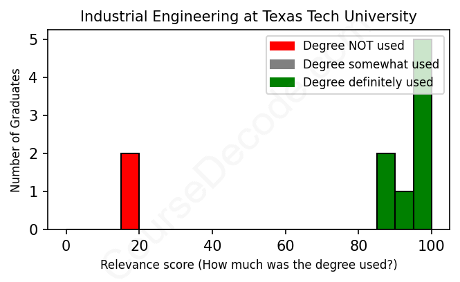The verdict? Significantly above average. Overall, with an average relevance score of 79%, Industrial Engineering graduates from Texas Tech University have a much higher likelihood (+12%) of finding work in this field compared to the average graduate across all fields: