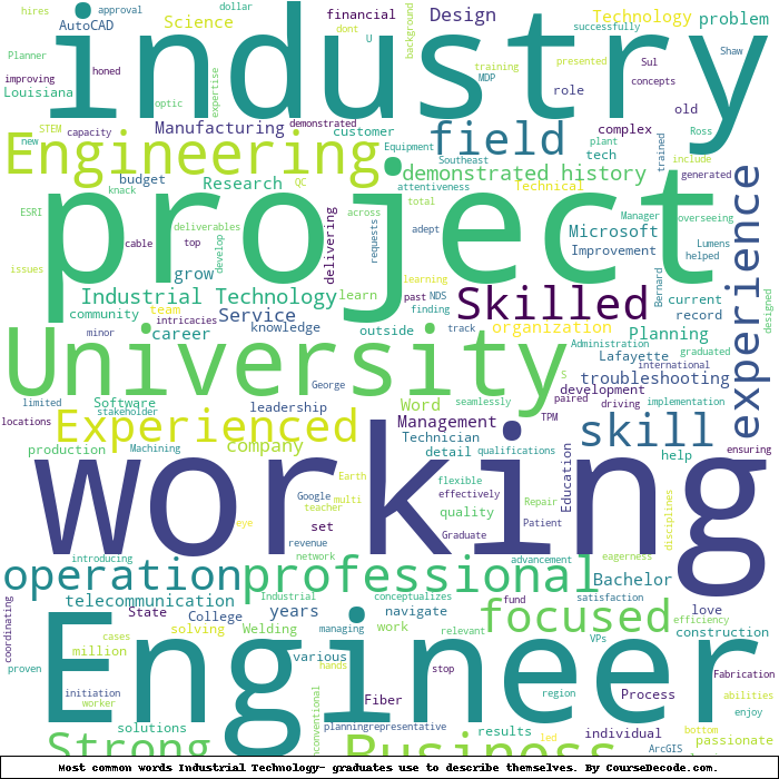 Here is a visual representation of the most common words seen in the "about" section of LinkedIn profiles who have a Bachelor degree in Industrial Technology-. This may or may not be useful: