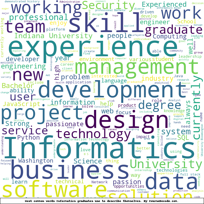 Here is a visual representation of the most common words seen in the "about" section of LinkedIn profiles who have a Bachelor degree in Informatics. This may or may not be useful: